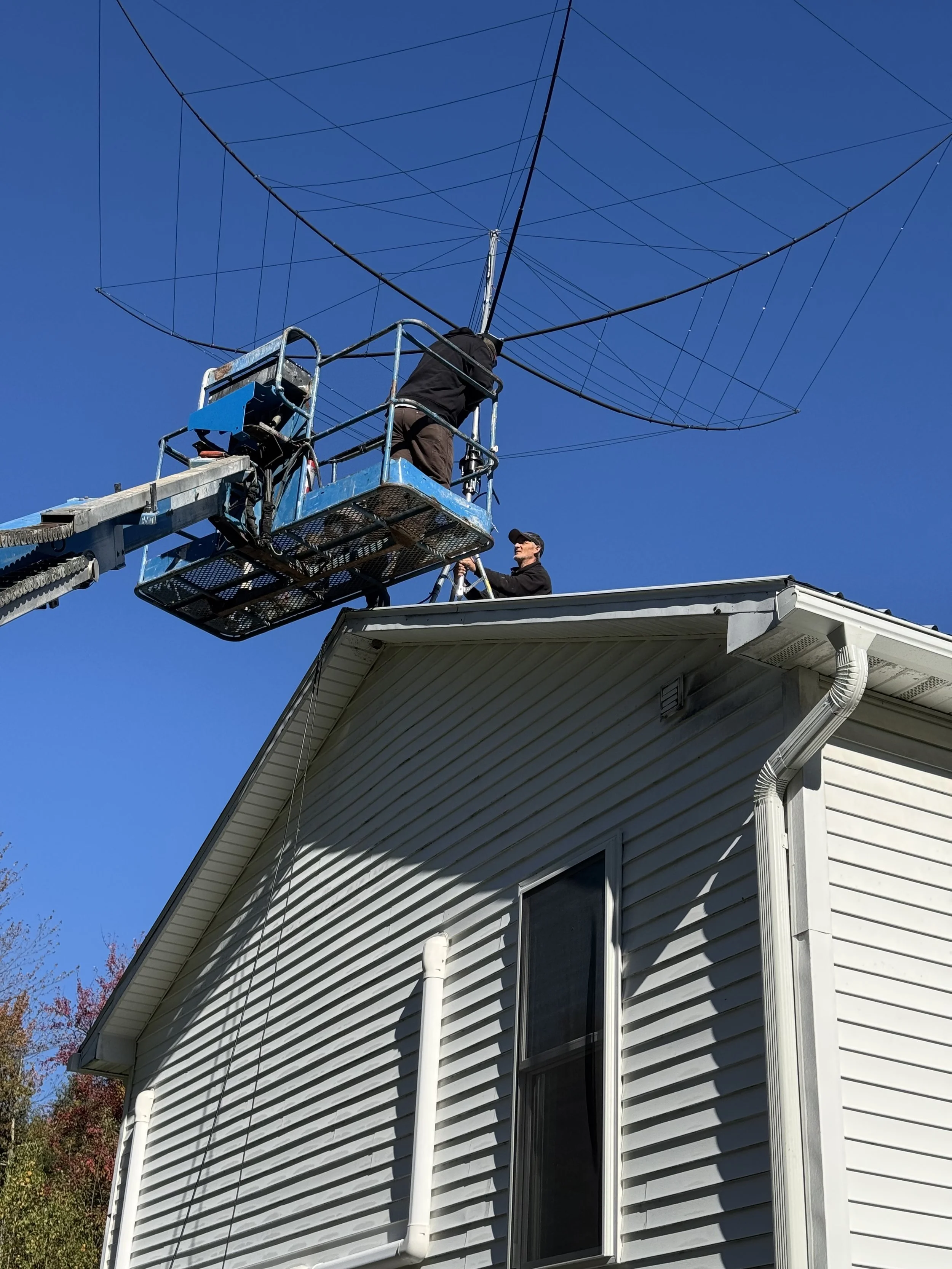 The initial attempt went well. And, yes, the *initial* attempt. Here is the lift taking the antenna to the roof. The lift has a cage or bucket. They lifted the antenna outside the bucket so they wouldn't have to lift it over the bucket (it's very unwieldy).