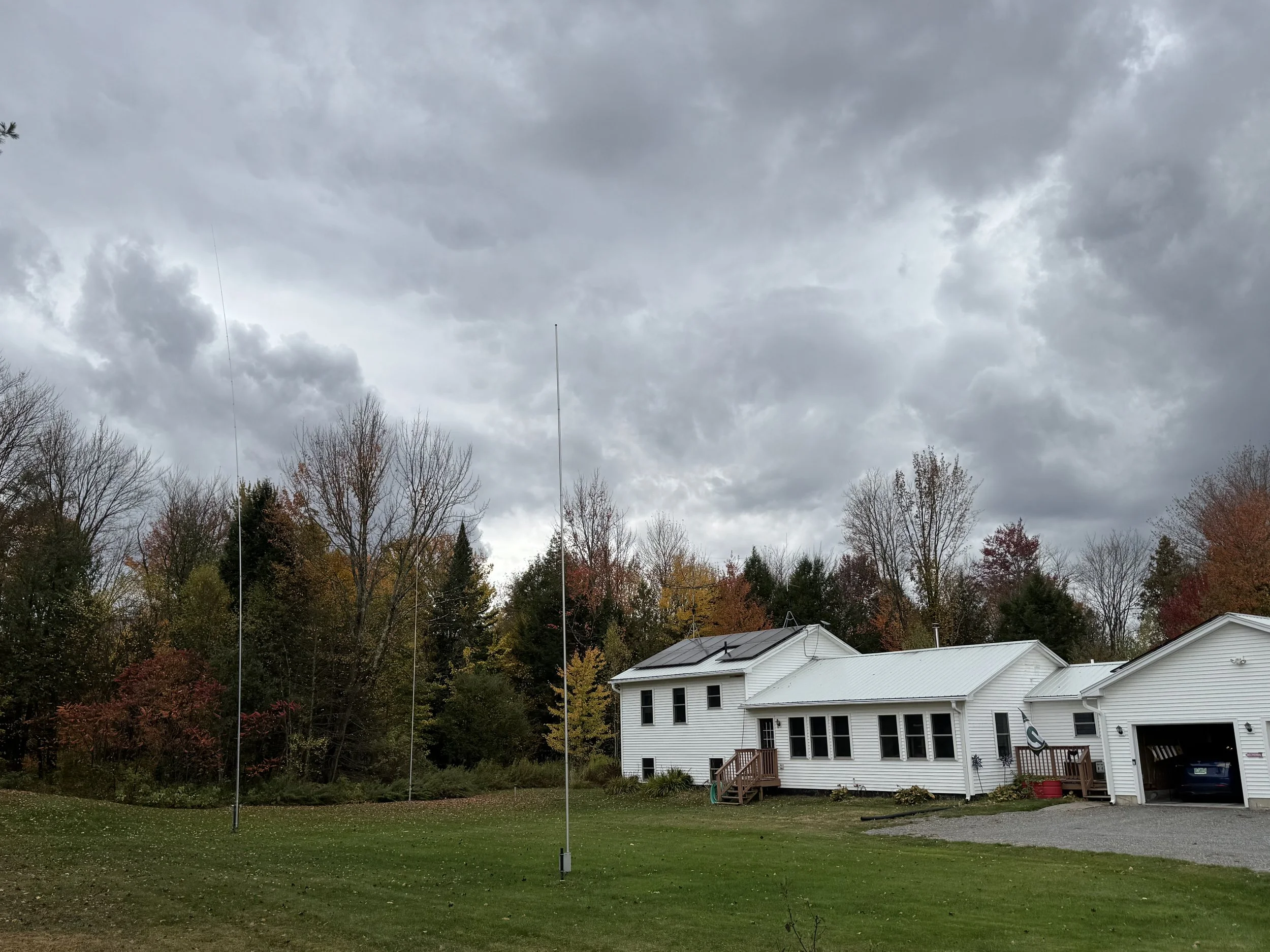 In the foreground is my 37-foot 40-meter vertical. To the left and back is my 67-foot 80-meter vertical. And between them, further back, is my 43-foot all-band 80-6 meter vertical. On the roof is the hex beam. You can really tell how much it is hidden with the black painted spiders.