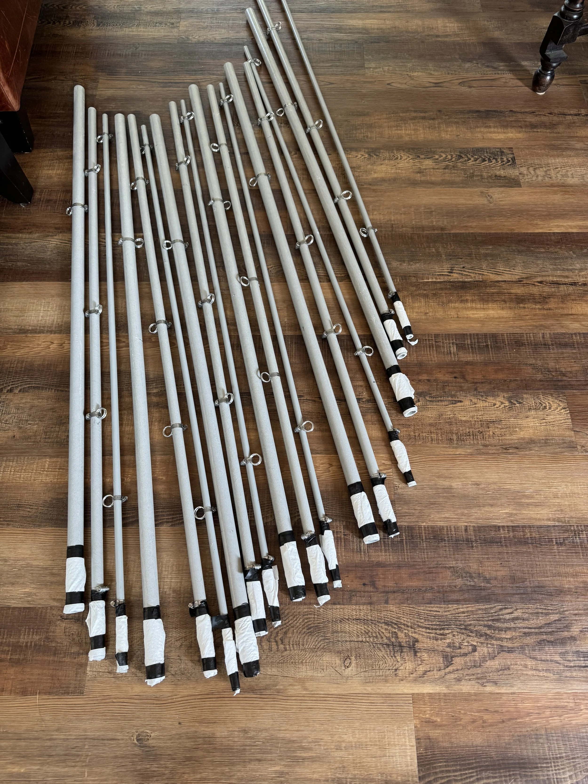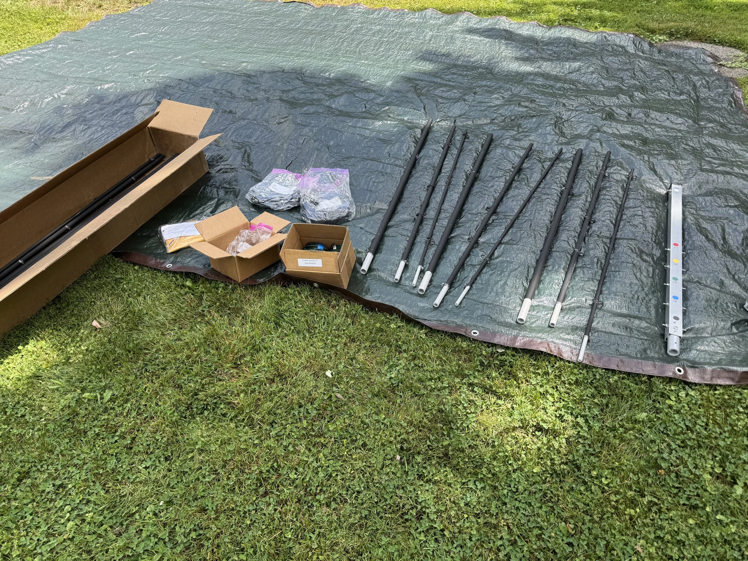 The parts laid out on the tarp. More spreaders in the box and the antenna wire and spreader ropes in their own boxes as shipped.