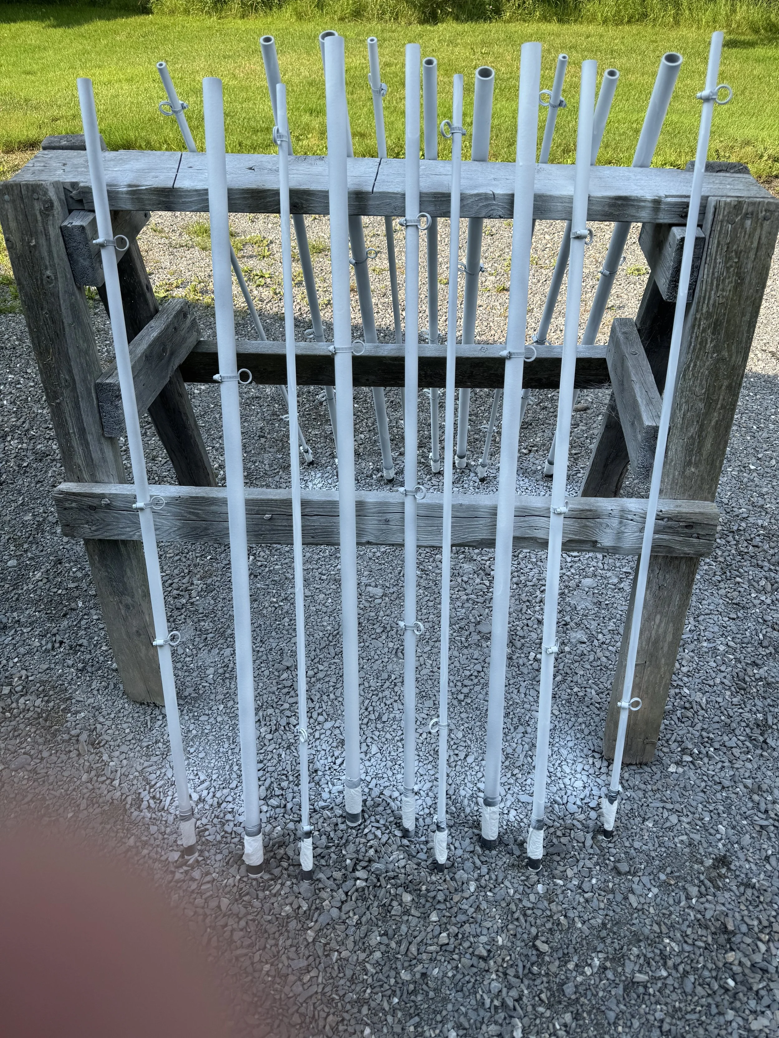 Oh, did I mention that my drill bits wouldn’t go through the pipes? Yeah, I had to take the masts to Ace Hardware to get the holes drilled. Three times. Interestingly, they use the same drill, looked like the same drill bits, but theirs worked. Mine didn’t. Don’t count how many times I went to Ace Hardware (who were really, really helpful through all this…).