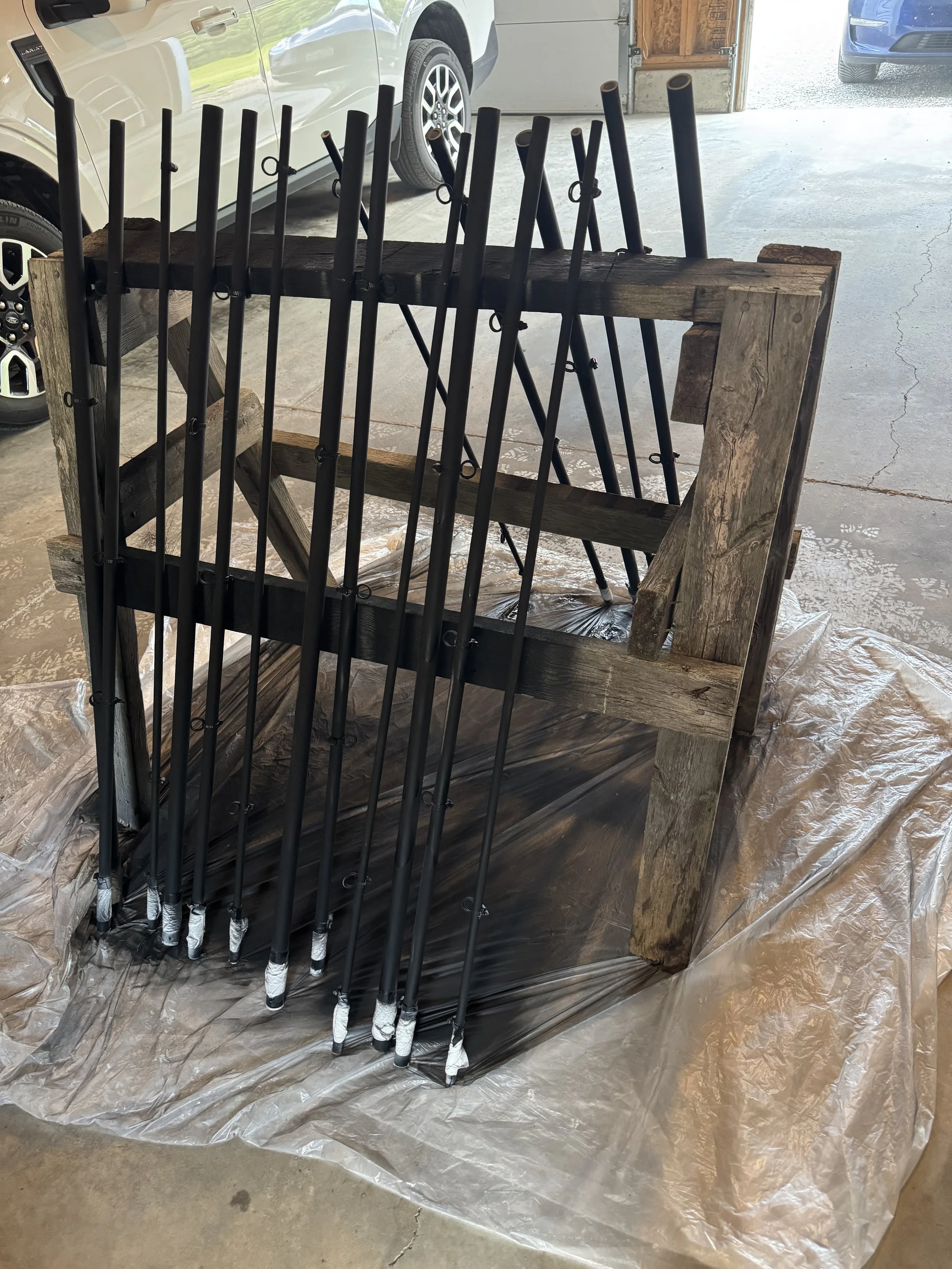 As noted before, I let this dry for two full day’s. This amount of priming took three cans of spray paint. I used the Universal Bonding Primer from my local ACE Hardware store. Then, after the two days, I moved into my garage because it was going to rain and completed the painting part. For that, I used Flat Black non-reflective finish. You can see in the top picture how it blends into the trees around my property. Here’s the painting station: