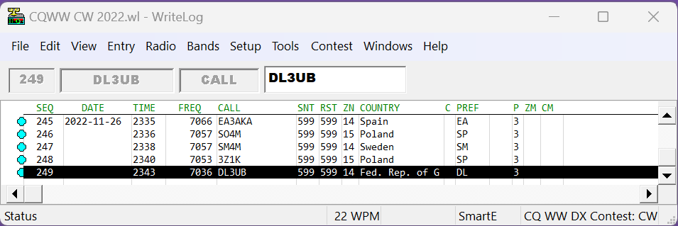 Let's assume that the last call worked is incorrect in the log from a too-fast Enter. You realize that the call should have been DL3US and not DL3UB. Whatever field needs editing, you just double click on it and the dialog above the log comes up. Since we need to correct the call, double click on the call. If the Zone would have been incorrect, double click on the zone.
